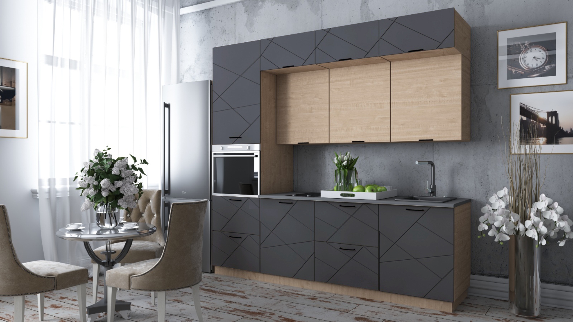 Цветовое решение представленное на сайте: фасад графит софт/корпус дуб ирландский.